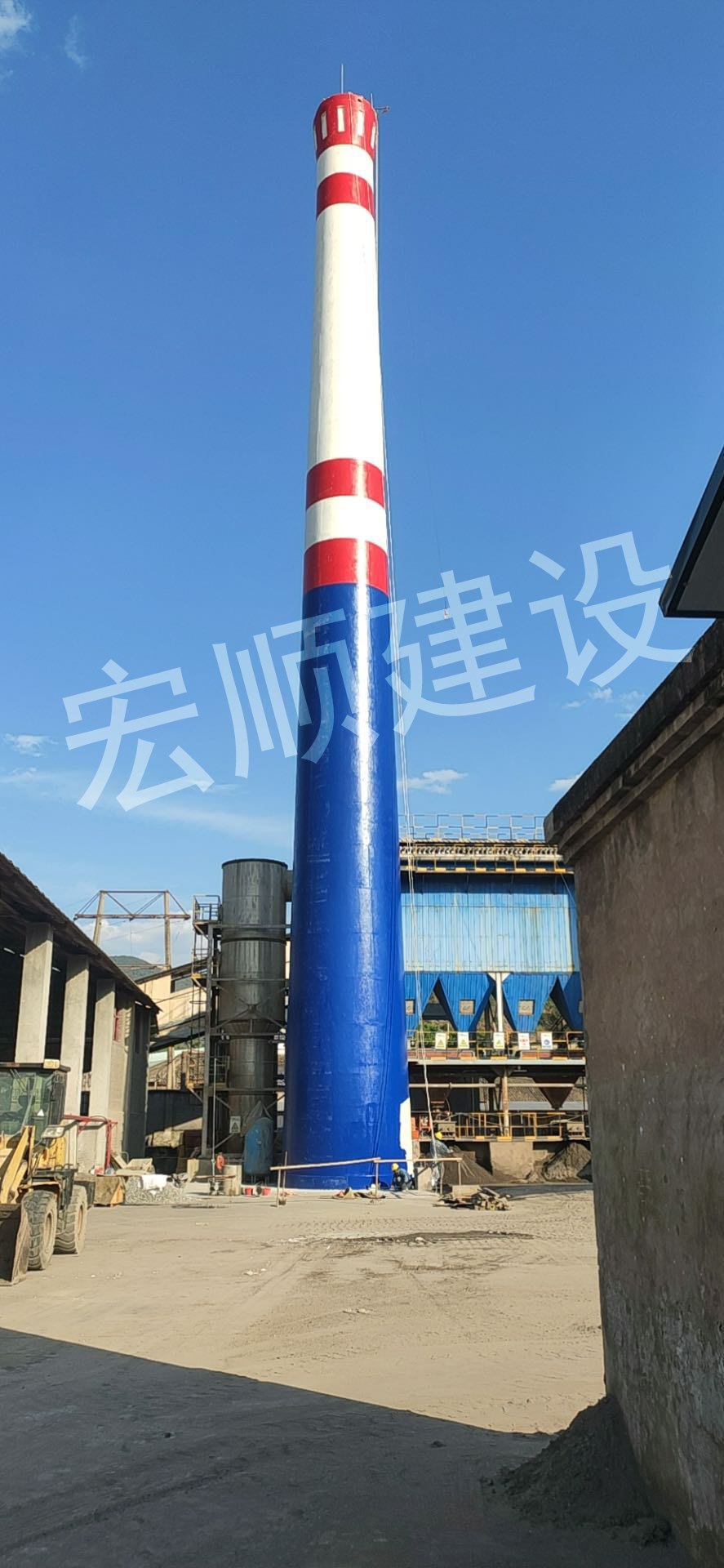煙囪表面清理:在對煙囪表面進行粉刷美化處理之前必須進行表面預處理、除去煙囪表面松動鼓起部份、對剝落嚴重點鏟除、露出堅實基體、然后對煙囪表面進行清洗、除去表面的附著物、并對表面起到一定的毛化作用、并進行修補、太深的用膩子補平。金屬構件:在對煙囪爬梯、平臺嚴重損壞的、采用拆除、修補、更新、要確保設備完好及人身安全、生產安全。表面采用鋼絲刷、鏟刀、砂紙等工具進行人工除銹局部采用機械打磨、刷底漆前將表面清潔干凈、再涂刷底漆二遍、干燥后12小時面漆二度。 煙囪色環:對筒壁外表面140—210米標高處、刷成紅白相 間色環。要求達到較好的美觀感觀要求、紅白、色界清晰、平直、 無色澤混雜、各段色環色澤鮮艷、保光保色性能好、光潔性好、不易被污染、即使受污染也易于清潔復原。對筒壁外表面160—165米標高處、采用紅色馬賽克貼年號字樣、并用航空標志漆涂成紅色。